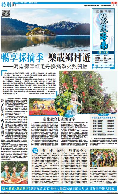 為打造保亭紅毛丹品牌,推廣鄉村旅游精品線路和產品,發展集水果采摘、休镕度假、黎苗美食、戶外運動、鄉村體驗、雨林探險於一體的美麗鄉村旅游,保亭旅游發展委員會日前啟動了以「暢享采摘季樂哉鄉村游」為主題的保亭全域鄉村旅游紅毛丹采摘季活動。活動不僅掀起了當地暑期旅游新的熱潮,更產生了巨大的「旅游+」輻射效應,促進了當地經濟發展、農民增收。保亭縣政協副主席、縣旅游委主任林孟地表示,保亭紅毛丹采摘季活動已連續舉辦5年,有力促進保亭全域旅游發展,已成為保亭旅游又一張靚麗名片。香港商報記者 吳軍暉 通訊員 郭羽佳
