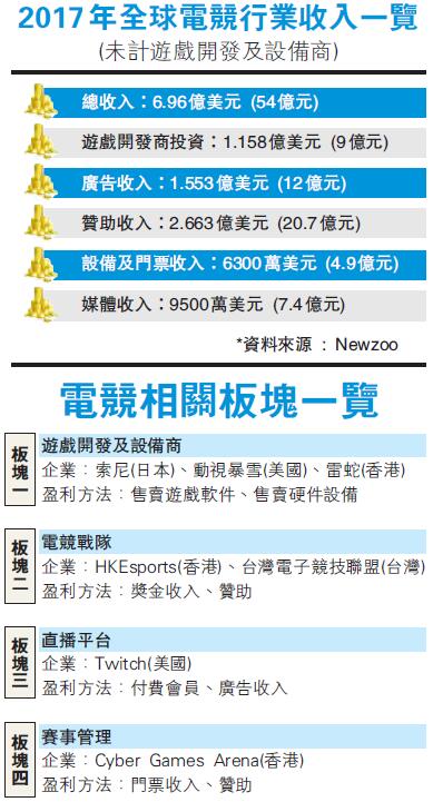 據Newzoo統計顯示,未計遊戲及電競設備收入,電競相關產業的收入來源主要是遊戲開發商投資、廣告收入、贊助收入、設備及門票收入以及媒體收入,當中以遊戲開發商投資最多,可見現時電競產業仍未有盈利能力。然而,電競產業的潛力亦是一眾新興行業中數一數二,皆因玩家以及觀眾收益增長迅速。2015年全球電競愛好者平均貢獻2.7美元(21.06元)予電競產業,但2017年已達到5.2美元(40.56元),兩年間收入增長92%,業界估計2020年人均電競支出會增長至11美元(85.8元),可見電競產業的毛利率將會進一步上升。