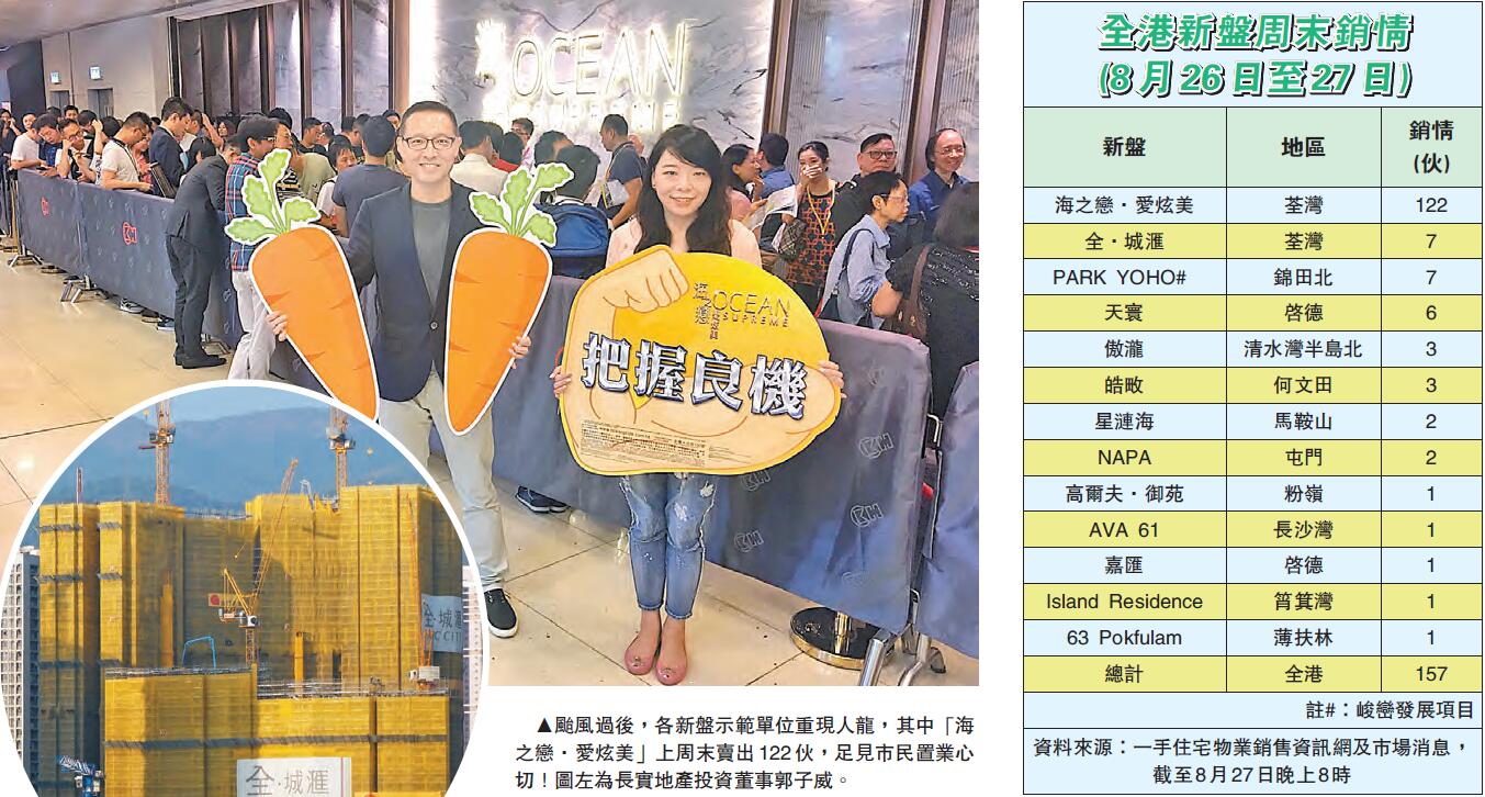 受到颱風影響,全港各區新盤成交量仍錄得157宗,較上一個周末高出38宗,風暴過後部分新盤售樓處更出現人龍,反映市民置業心切,以及投資者仍看好目前樓市。