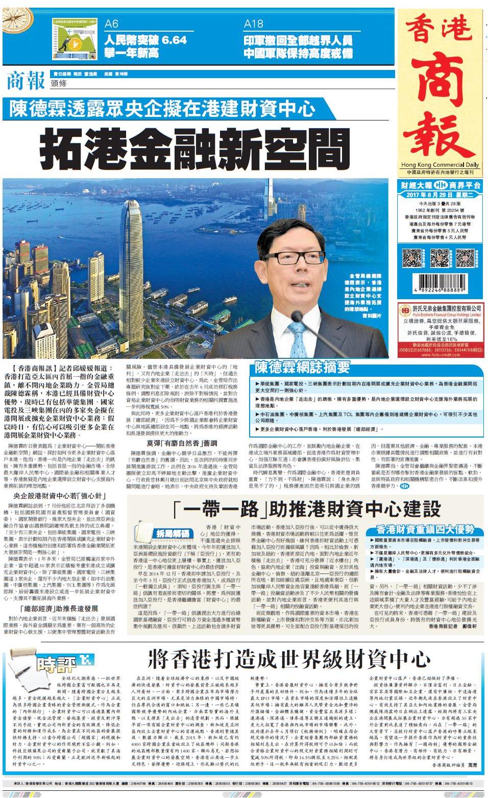 陳德霖昨日發表題為「企業財資中心——開拓香港金融新空間」網誌,探討如何令更多企業財資中心落戶本港。他指,香港一向是內地企業「走出去」的跳板,擁有多重優勢,包括首屈一指的金融市場、全球最大離岸人民幣中心、國際級金融和相關專業人才等。香港無疑是內地企業選擇設立財資中心支援海外業務拓展的理想地點。
