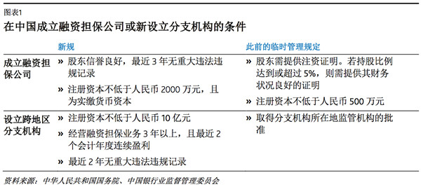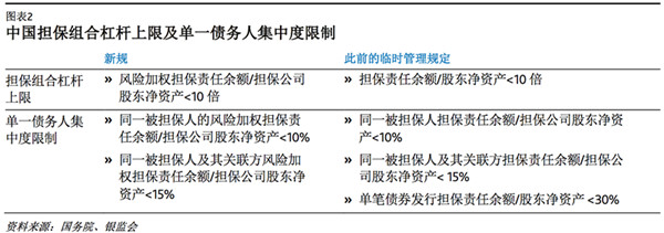 具體來看,新規在成立融資擔保公司原有最低500萬元的注冊資本要求上大幅提升至2000萬元 ,同時要求設立跨地區分支機構注冊資本不得低於10億元(見圖表1)。穆迪分析稱,此項要求可以確保企業擁有充足的資本金,從而在擴大規模時保持一定的償付能力充足率。此外,通過對新設分支機構的融資擔保公司設置最低3年的業務經營記錄,以及連續兩個會計年度持續盈利的業績門檻,也可以限制從業企業過度激進增長。
