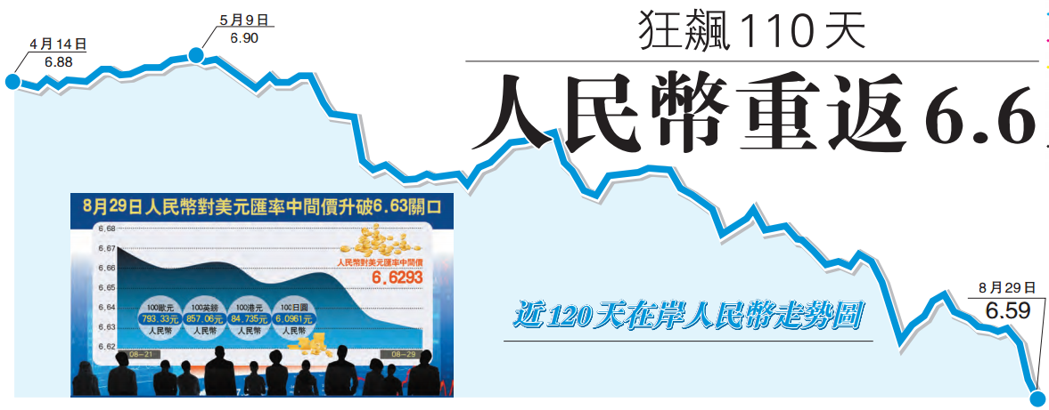 【香港商報网訊】從6.9到6.6,110天,人民幣一路狂飆突進。截至8月29日,人民幣對美元匯率中間價的最新數據為6.6293;在岸人民幣兌美元今日收盤大漲348點,單日漲幅達0.53%,收盤一舉突破6.60關口,創下逾14個月新高;離岸人民幣也漲破6.60關口,創逾一年新高,且有進一步升值的勢頭。