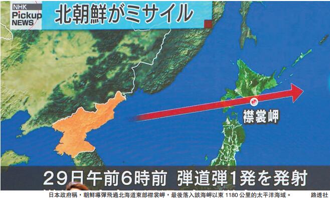 韓軍聯合參謀本部說,韓國時間29日早上5時57分左右,朝鮮從首都平壤順安區附近發射一枚導彈,飛行距離超過2700公里,最大飛行高度大約550公里。分析認為,從飛行距離和最高高度等數據看,朝鮮這次很可能以正常角度、而非此前常用的高角度發射。日本政府說,導彈在當地時間早上6時06分左右飛過北海道東部襟裳岬,6時12分左右落入這一海岬以東1180公里的太平洋海域。導彈經過北海道上空的時間約兩分鐘,觸發日本提醒國民注意的全國瞬時警報系統。