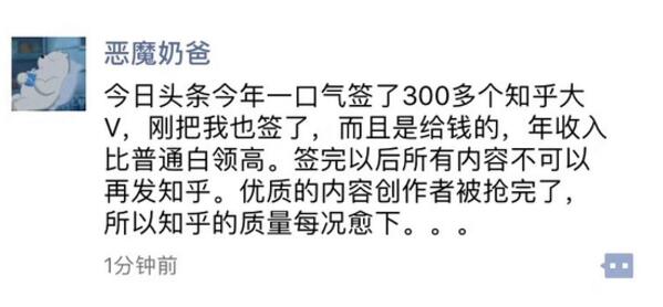 8月29日消息,網上曝光一張疑似知乎大V“惡魔奶爸”的朋友圈截圖,圖中內容表示,今日頭條今年簽下包括他在內的300多個知乎大V,提供比普通白領高的年收入,但要求以後內容不可發知乎。