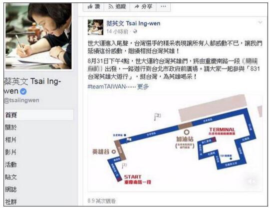今天(30日)傍晚,台北大運會將落下帷幕。明天,台灣方面將舉行“831台灣英雄大游行”。昨晚(29日)台灣地區領導人蔡英文也在臉書上貼出“831台灣英雄大游行”,為世大運台灣英雄喝采的訊息。同時,8月31日也是蔡英文的生日,不少人質疑此舉蔡英文是在沾大運會的光。