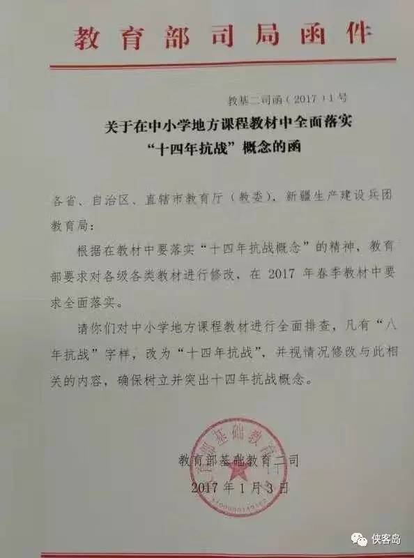 据俠客島1月12日报道,1月11日的一則新聞頗為引人注目:“教育部要求,在全國中小學教材中,將’八年抗戰’的說法,一律改成’十四年抗戰’。”