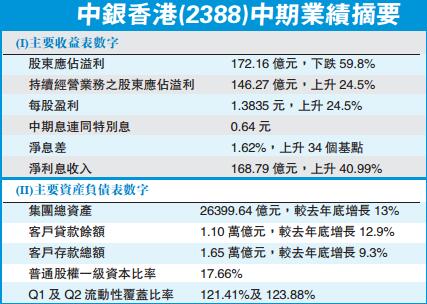 【香港商報网訊】記者邱媛媛報道:緊隨母行中國銀行(3988)腳步,中銀香港(2388)昨亦在收盤后公布截至今年6月底中期業績,純利跌近60%至172億元,主要因為去年同期出售集友帶來25.89億元收益所致,若單計持續經營業務,純利則升24%至146億元,中期息0.545元,特別息派9.5仙,合共派息0.64元。