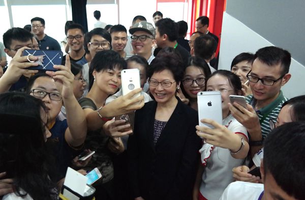 林鄭月娥參觀深港青年創新創業基地時,香港及內地實習生競相要與她合照。記者里行攝