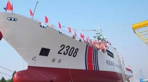 “中國海警2308”船,船長98米、排水量3980噸,配有先進的電力推進、綜合減搖、衛星通訊導航系統、船載直升機平臺和高壓水炮等設備。該船與去年下半年在東海分局入列的中國海警2305、2306、2307船為同系列姊妹船。