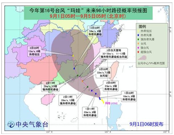 預計,“瑪娃”將以每小時10公里左右的速度向北偏西方向移動,強度逐漸加強,并向廣東中部一帶沿海靠近,將于3日白天在這一帶沿海登陸,登陸時強度為強熱帶風暴級或台風級(30-38米/秒,11-13級),登陸后迅速減弱。