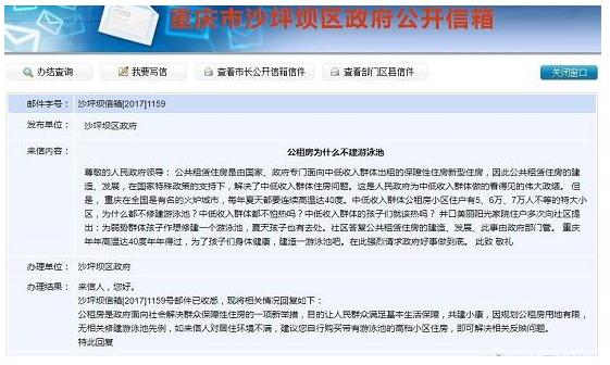 對此,沙坪壩區政府網上回應稱,公租房是政府面向社會解決群眾保障性住房的一項新舉措,目的讓人民群眾滿足基本生活保障,共建小康,因規劃公租房用地有限,無相關修建游泳池先例,如來信人對居住環境不滿,建議自行購買帶有游泳池的高檔小區住房,即可解決相關反映問題。