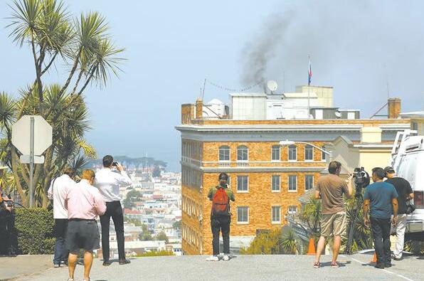 俄罗斯驻旧金山总领馆1日冒出黑烟,吸引了人们的关注。