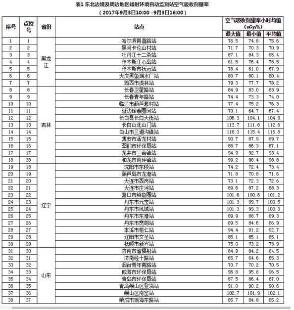 原标题:朝鲜第六次核试验东北边境及周边地区辐射环境监测结果2017年第1号(2017年9月3日17时)