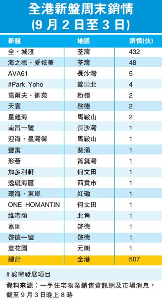 【香港商報网訊】記者曾浩榮報道:受惠荃灣兩大新盤熱賣,香港新盤市場9月做出個「開門紅」!綜合銷售物業資訊網及市場消息,截至昨晚8時,全港一手市場周末兩日(2日至3日)共賣出約507伙,較8月最后一個周末逾150伙水平超出約2.3倍。當中「全城」貢獻最大,一舉沽清次輪的432伙。全城沽清次輪432伙華懋發展的「全城」上周六(2日)作第二輪銷售,將餘下單位共432伙悉數推售。據市場消息,有關單位銷售當日晚上8時已全部獲認購。成交紀錄冊則顯示,當日有431宗成交(簽訂臨時買賣合約)。據價單定價推算,是批單位可為華懋套現約40億元。