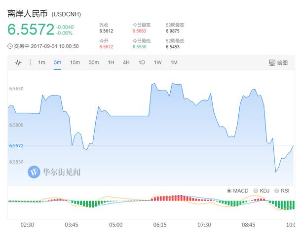 離岸人民幣亞市早盤也急速拉升上百點,截至發稿離岸人民幣兌美元報6.5572。