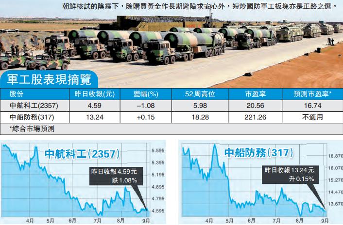 朝鮮核試的陰霾下,亞洲股市幾乎被震散,資金避險心切,不少人認為萬一開戰,最利好的是黃金及油股,但其實往往局部地區衝突出現時,周邊地區例必加強軍備及國防支出,因此除購買黃金作長期避險求安心外,短炒國防軍工板塊亦是正路之選,投資者不妨順勢留意兩隻軍工股份,包括中航科工(2357)及中船防務(317)。