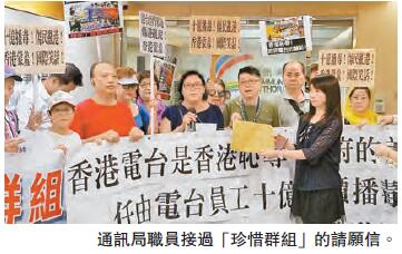 「珍惜群組」約17名成員昨日帶同橫額,由灣仔地鐵站出發至通訊辦門外。他們在通訊辦外高叫口號并譴責港台。團體發言人李璧而指,港台收取公帑卻批評政府,且經常發放反政府人士意見,散播中港矛盾言論,又忽視他們支持政府的聲音,是濫用言論自由及有違職業操守。她續說,港台主管任由員工中傷香港政府達20年,而通訊局一直沒有采取任何跟進工作也屬嚴重失職,要求通訊局現在撥亂反正加強監管港台,以善用公帑及給大眾市民一個交代。