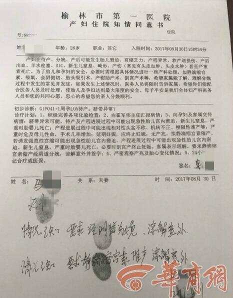8月31日20时左右,陕西榆林市第一医院绥德院区住院部5楼,一名待产孕妇从楼上坠下身亡。榆林市第一医院绥德院区发表声明称,产妇马某于8月30日15时34分,“停经41+1周要求住院待产”入院。“经初步诊断,马某第一胎41+1周待产,经检查发现胎儿头部偏大,阴道分娩难产风险比较大。”绥德院区妇产科二病区主任霍军伟接受华商报记者采访时表示,检查后医护人员就向产妇、家属说明情况,并建议剖宫产,然而家属坚持顺产,并在《产妇住院知情同意书》上签字。
