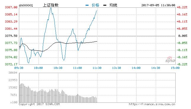 截止午盤收盤,滬指報收於3386.19點,漲0.2%,深證報收報10977.74點,漲0.14%。