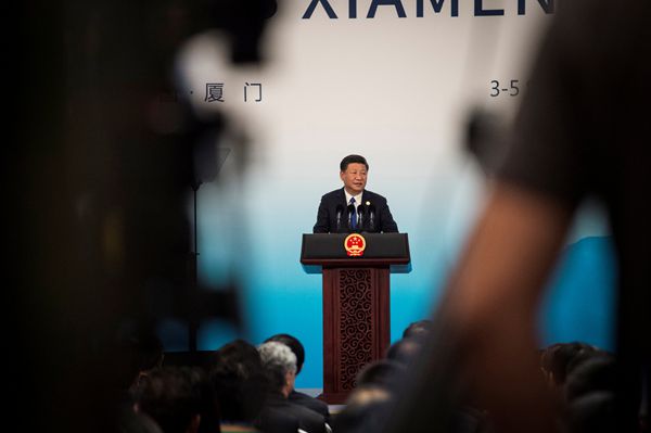 9月5日,中国国家主席习近平在厦门国际会议中心会见中外记者,介绍金砖国家领导人第九次会晤和新兴市场国家与发展中国家对话会情况。中新社发 侯宇 摄