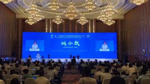 图为《海外华文新媒体发展报告(2017)》发布现场,人民日报海外网总经理、总编辑姚小敏致辞。