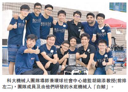 繼科大團隊的Robocon小隊「火之龍」,於今年6月的全港大專生機械人大賽中8度奪冠後,另一支專責設計水底機械人的科大機械人小隊「白鯨」,亦擊敗來自歐洲、美加、亞洲,以及中東地區的24支冠軍隊伍,奪得國際遙控機械人大賽世界賽的全場總冠軍以及安全意識獎。