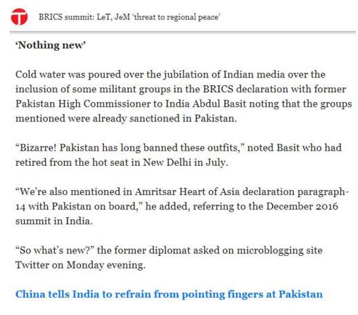 对于“高调”的印度媒体,巴基斯坦主流英文媒体《论坛快报》反唇相讥:“对于一些军事组织被金砖宣言点名这件事,该给狂喜的印度媒体泼点冷水了,巴基斯坦驻印度高级专员Abdul Basit说过,以上被提到的武装组织早已被巴基斯坦制裁。”