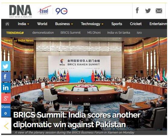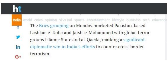 《印度斯坦时报》写道,“周一金砖集团把以巴基斯坦为活动基地的虔诚军(Lashkar-e-Taiba)和穆罕默德军(Jaish-e-Mohammed)与全球恐怖主义组织伊斯兰国和基地组织并列,这是印度对抗跨境恐怖主义的一次重大外交胜利。”