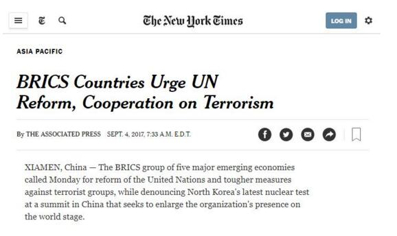 而5日的《金砖国家领导人厦门宣言》(以下简称为“《金砖宣言》”)也成为国际媒体关注的焦点。