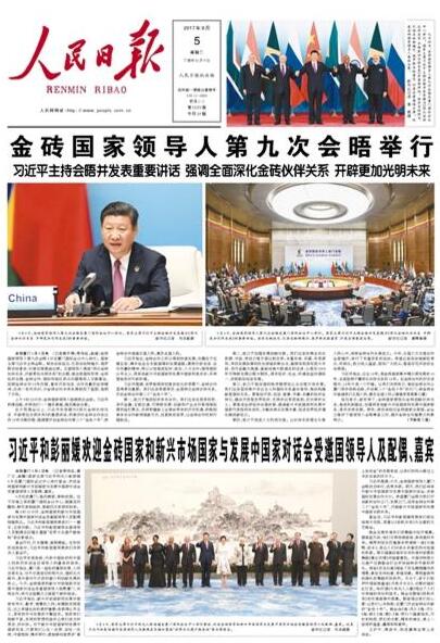 《人民日报》头版整版报道了金砖峰会的盛况。
