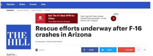 美国《国会山》报9月5日援引美国广播公司消息称,美国国民警卫队(National Guard)称一架属于亚利桑那州空军警卫队F-16“战隼”战斗机,当地时间周二下午在萨福德(Safford)西北方20里附近失事坠毁。
