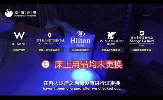 “蓝莓评测”称,北京W酒店、三里屯洲际酒店、希尔顿酒店、JW万豪酒店和香格里拉饭店分别不同程度存在床品、卫浴用品未彻底清洁的状况。