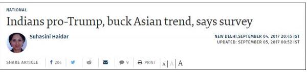 史密斯在接受《印度教徒报》采访时表示,印度的调查结果与日本、韩国、澳大利亚、印尼和中国受访者的看法形成鲜明对比。“毫无疑问,特朗普上台已经削弱了美国在亚洲地区的影响力。但只有在印度人眼里,美国的影响力是最强劲的,印度人对美国目前和未来在亚洲的角色持非常积极的看法。”