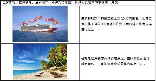 星梦邮轮「云顶梦号」去年在广州(南沙港)母港盛大启航,令南沙跻身国际邮轮母港的行列,标志着广州邮轮旅游时代的开端。今年11月,「云顶梦号」将以新加坡为母港,开展到访泗水、北巴里以及槟城、普吉、吉隆坡的两条航线;而「云顶梦号」姐妹船「世界梦号」将接棒进驻广州南沙,开展全年母港运营,提供逢周日出发的两条全新6天5晚航线,到访菲律宾马尼拉、长滩岛及越南胡志明市、芽庄,以及逢周五出发的香港3天2晚周末海岛漫「邮」航次。