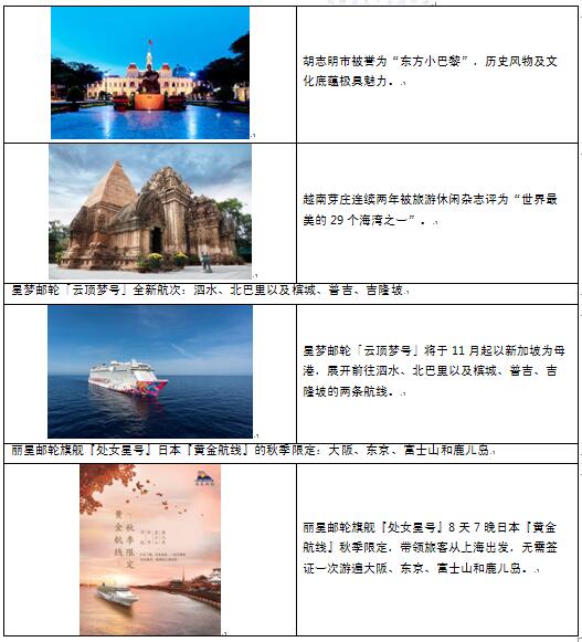 云顶邮轮集团旗下另一品牌丽星邮轮将携旗舰「处女星号」亦于旅博会现场亮相,喜欢日本的广东旅客可重点关注由上海出发的8天7晚独家“黄金航线-秋季限定”航次,到访大阪、东京、富士山、鹿儿岛四地,一条航线网罗日本最热旅游目的地,尽情感受日本秋季的诗情画意。