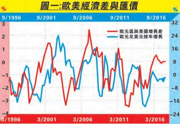圖一可見,歐元區與美國經濟增長差與歐元兌美元按年增長走勢整體相若,前者領先約兩個季度,因此可作匯價短線走勢參考。在這前提下推測歐元兌美元匯價按年增長將見上升(藍尖嘴),可見其匯價有機會再創近三年新高,突破1.20重要關口。