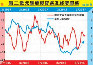至於通脹,匯價升勢過強,將難免使入口價格回落,間接拉低整體消費物價指數。因此圖三可見,歐元名義有效匯率按年增長走勢與歐元區整體通脹(除了在2009年金融海嘯及歐債危機時關系不太明顯下)兩者整體走勢呈反比關系。匯價按年增長走勢反映在五個季度后的通脹水平,由此可見歐元區通脹在未來兩年呈下行壓力,在這前提下未見有加速收緊貨幣政策步伐的需要。