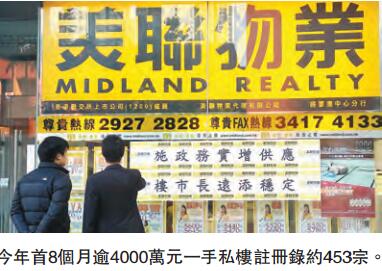 註冊金額方面,今年首8個月逾4000萬元一手私樓註冊金額錄約352億元,較去年首8個月錄約247億元及前年的229億,亦分別上升約43%及約54%。今年首8個月逾4000萬元一手私人註冊量,高於歷年同期該類物業註冊量,註冊量創同期歷史新高,顯示后市具承接力。