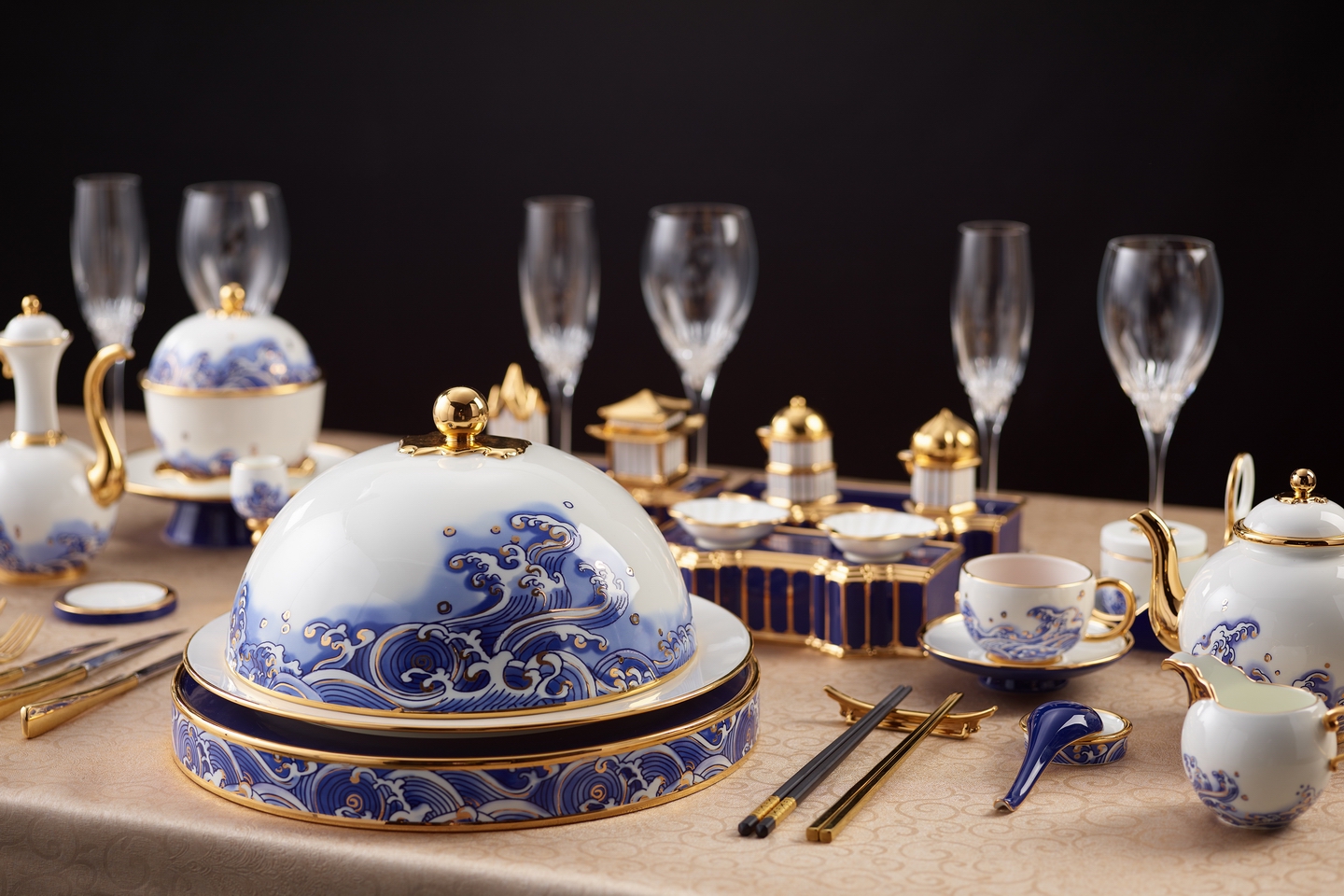 而作為雙邊會談宴會的用瓷“金蘭之友”則以蘭花為主畫面,融彙廈門本土文化符號、中國傳統元素,又配以大面積手工純金,中西合璧,相得溢彩,演繹後現代藝術的絢麗,傳揚世界時尚之風潮。表達了金磚國家成員友誼的珍貴,同時也體現了金磚國家成員同舟共濟、攜手合作的精神。