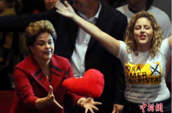 资料图:当地时间2016年8月23日,巴西圣保罗,巴西遭停职总统罗塞夫出席民主运动会议,与民众互动。