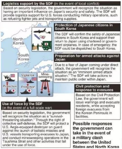 一个专门爆料内幕消息的脸书账号“匿名者”(Anonymous)甚至分析称,战争一旦爆发,日本政府可能有五种紧急应对措施:如果发生地区性冲突,将由日本自卫队提供后勤支持;如果全面战争爆发,则动用自卫队的武力;保护在韩国的日本公民;准备应对针对日本的军事袭击;撤离和侨民保护。