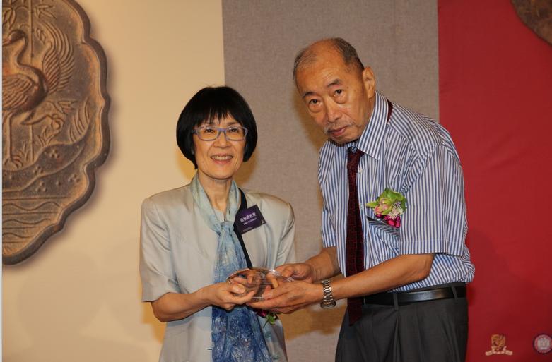 香港中文大學副校长张妙清教授(左)致送纪念品给铜镜惠赠者麦继强教授。