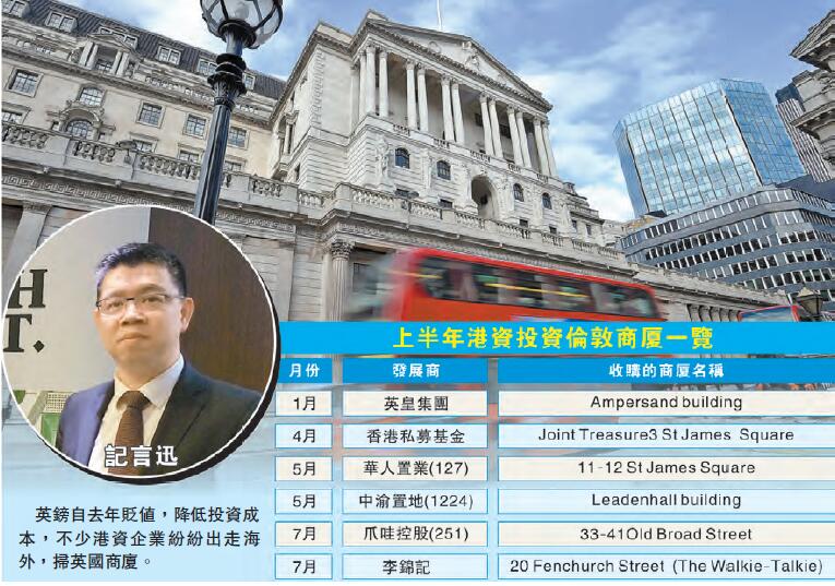 相比於內地地產商以「癲價」來港搶地,近年不少港資企業紛紛出走海外,投資英國商廈市場。有分析指,英鎊自去年起貶值,降低投資成本,加上英國資產升值能力高,因此不少港資選擇投資當地。例如遠東發展(035)管理層計劃下半年推出英國曼徹斯特Angel Meadow地產項目,同時計劃在英國擴充集團酒店組合。