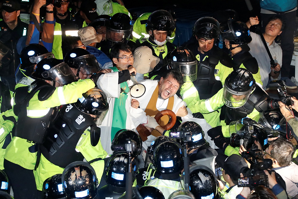 韓國警察將頑強抵抗的反薩德示威民眾一點一點推開。