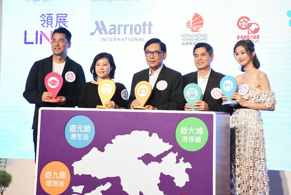 左起:藝人王敏德、旅發局副總干事葉貞德、領展執行董事及行政總裁王國龍、萬豪國際集團亞太區總裁何國祥及藝人岑麗香一同為游樂團揭開序幕。記者馮瀚文攝