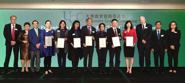 教資會杰出教學獎頒獎典禮昨日舉行。圖為教資會主席唐家成(左三)與遴選委員會成員Adrian Dixon教授(右三)及得獎者陳英凝教授(左四)、郭致偉博士(中)和蘇可蔚教授(右四)等人合照。