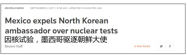 因朝鲜近日进行核试验,墨西哥政府已经宣布朝鲜大使为不受欢迎的人,限其72小时内离境。