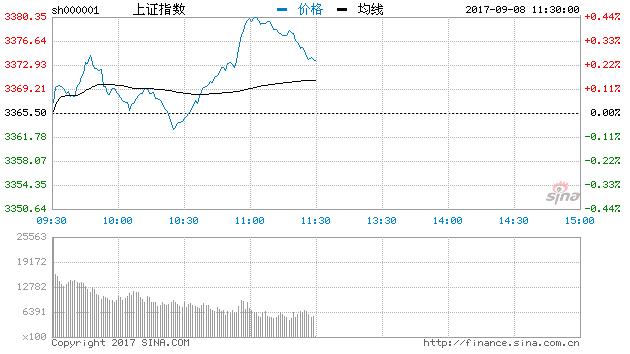 新浪财经讯 9月8日消息,两市早盘小幅低开,沪指经过短时间震荡后再度上行,创指也由跌转升,但成交量仍显不足。煤炭、有色金属、基因测序等板块表现活跃,无人驾驶等题材股稍显暗淡。临近上午收盘,股指有所回落,创指再度翻绿。截止上午收盘,沪指报3373.68,涨0.24%,深指报10986.16,涨0.16%,创指报1888.04,跌0.12%。