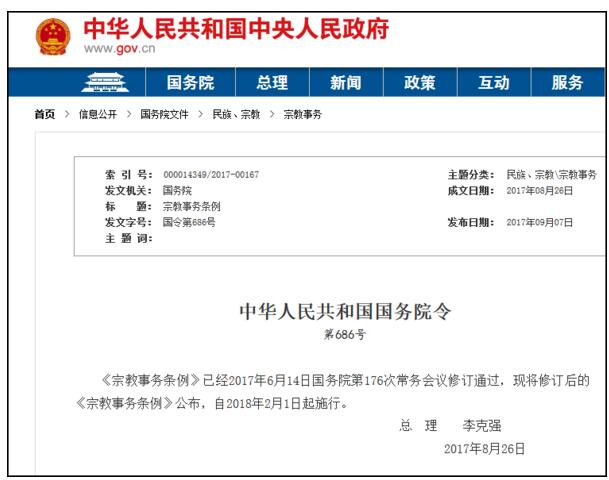 国务院总理李克强日前签署国务院令,公布新修订的《宗教事务条例》(以下简称《条例》),自2018年2月1日起施行。《法制日报》提及,新修订的条例规定禁止以宗教名义进行商业宣传、禁止以慈善名义接受境外附条件捐赠、宗教教职人员开展慈善活动受法律保护、从事互联网宗教服务应经过审核。