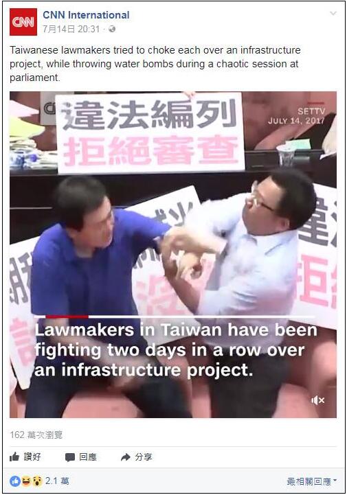 7月14日,剪辑过的群架视频还被CNN贴在脸书上,不到一天时间,观看次数超百万,截至7月16日下午,有2.1万人表达情绪,1.2万人分享,3千多人留言。